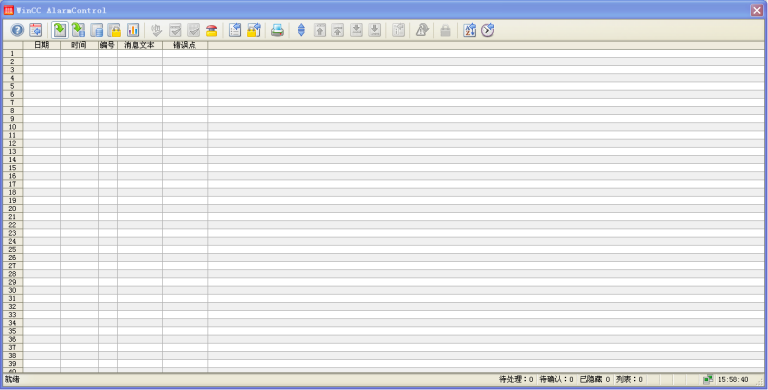 Esta tela é usada principalmente para exibir as informações de alarme do dispositivo e armazenar essas informações para visualização posterior. Conforme mostrado na figura, todos os alarmes têm tempo de alarme, tempo confirmado, mensagem de alarme e horário de fim de alarme. Quando um alarme aparece, o operador pode selecioná -lo clicando nele e pressione o botão "confirmado" para confirmar o alarme e o tempo confirmado pelo alarme será exibido. É importante observar que os alarmes só podem ser confirmados quando ocorrem. Se houver muitos alarmes a serem exibidos em uma tela, a tela poderá ser invertida usando os botões "Virar para cima" e "deslizar para baixo".